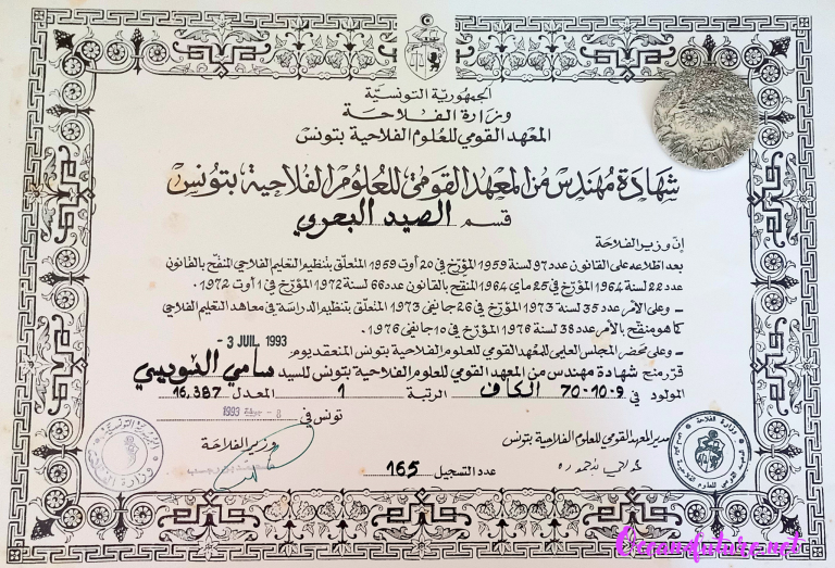 He also received from the Food and Agriculture Organisation via its Regional Office in Tunis the FAO Silver Medal (Memorial of the World Food Day, 16 October 1991) for his academic and research achievments, particularly with his significant contribution to study the royal shrimp fishery and its ecological and economic context in the Gulf of Gabès in the south of Tunisia. His final dissertation was greatly appreciated by the examination board, which awarded him an exceptional score of 19/20 (95/100).