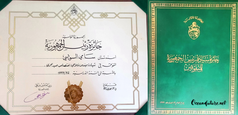 Certificate of the Presidential Award received by Sami Souissi in July 1993.