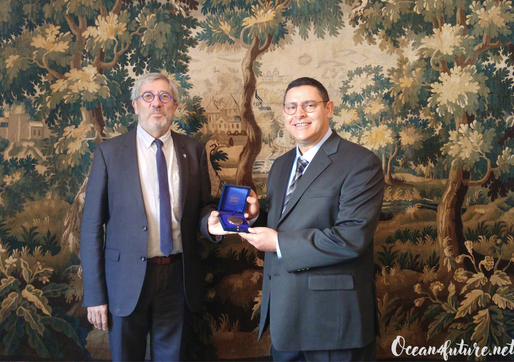 President of French Academy of Sciences, Professor Patrick Flandrin gives the medal of the 2020 Award received by Sami Souissi.