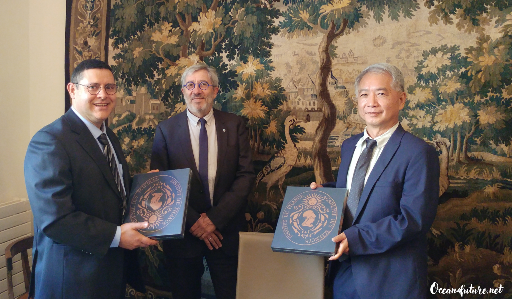 Sami Souissi and Jiang-Shiou Hwang received the book ‘350 years of the Academy of Sciences’ as a gift given by the President of the Academy of Sciences, Patrick Flandrin (shown in the photo between both awardees) during their memorable visit to the Institut de France – Paris in September 2021.